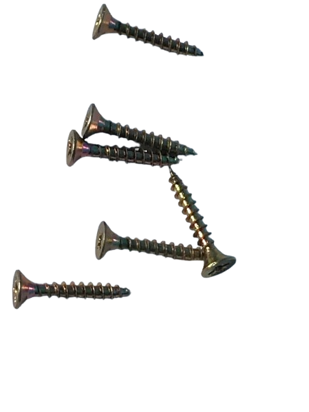 Vis à bois aggloméré à tête fraisée à empreinte cruciforme (Panovis), fabriquée en acier avec traitement de surface zingué bichromaté, disponible en diamètres de 2,5 mm à 6 mm et en longueurs de 16 mm à 100 mm.
